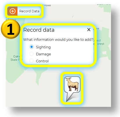 To add new information: (1) Open the Map, select the 'Record Data' button, choose the type of information you want to enter, then click on the map to select the location of your record; and (2) Complete the form questions, then submit your entry.