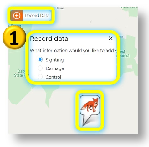 To add a new record; (1) Select the 'Record Data' button, select the type of data you wish to enter, and click on the map to place your record marker, (2) Answer the questions in the form then submit your entry.