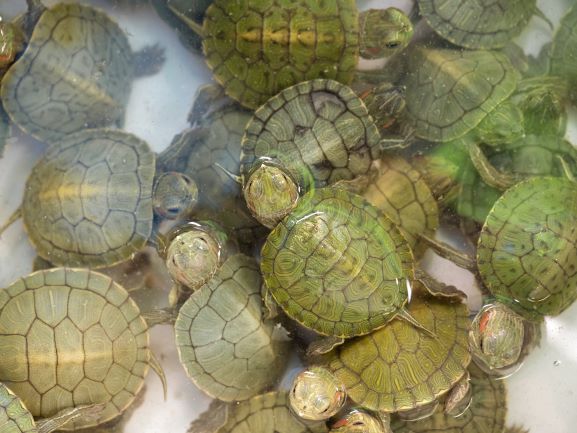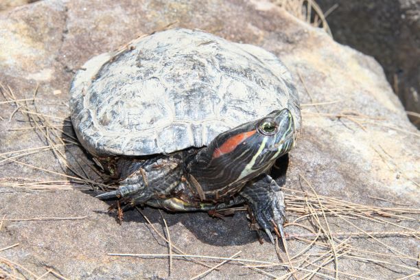 Red-eared slider turtles will bask on rocks, logs and other objects. They may also be seen basking on top of each other.