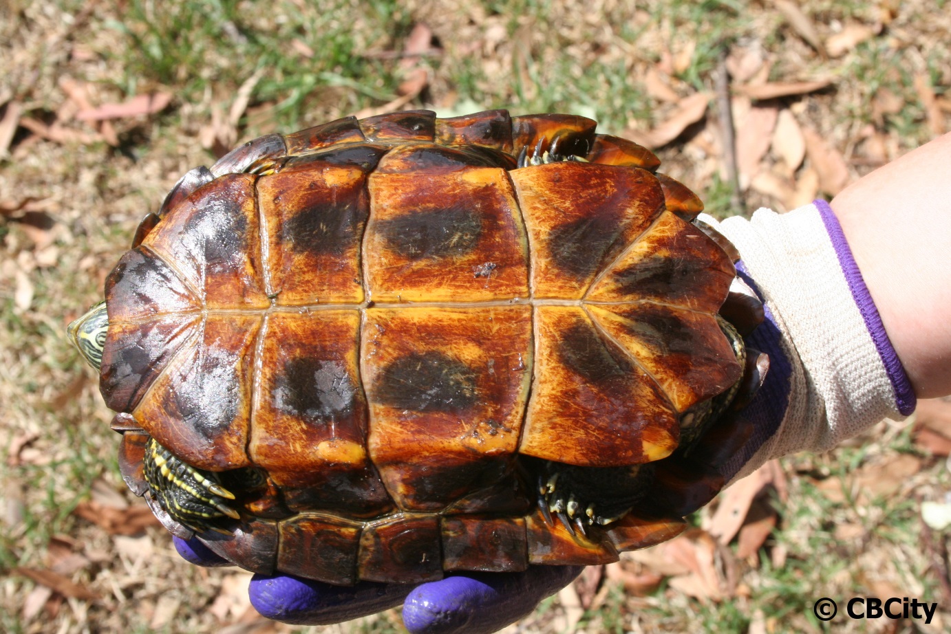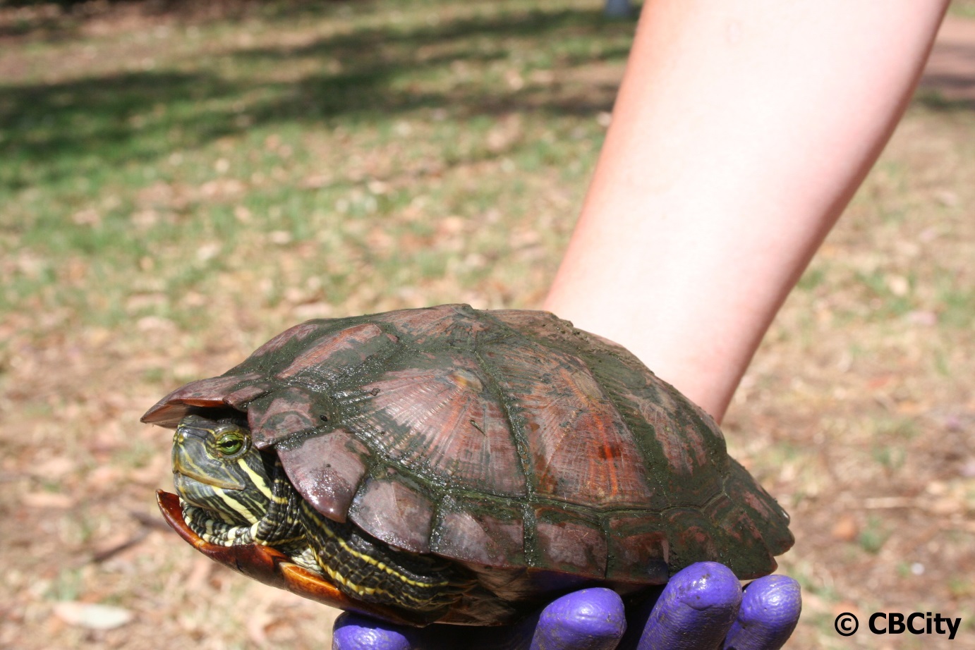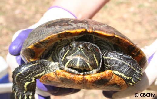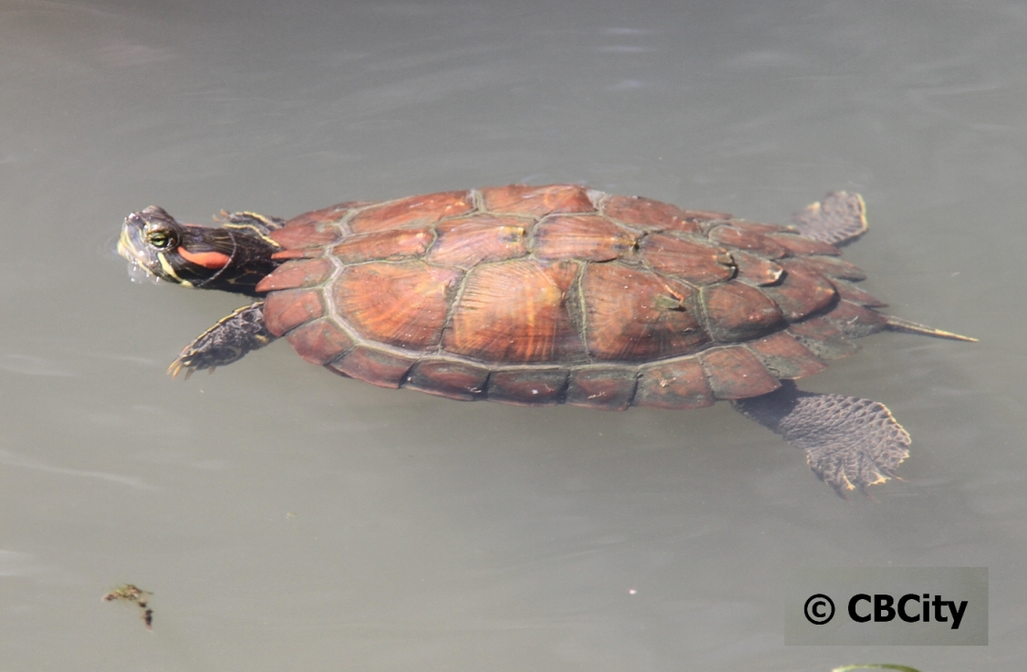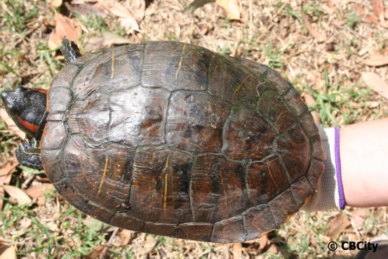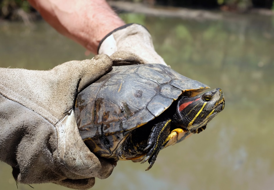 Red-eared slider turtles will retract their head straight back into their shell, while most native species wrap their head around the side of their shell.