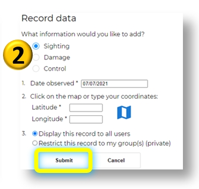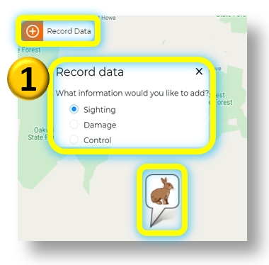 To add a new record; (1) Select the 'Record Data' button, select the type of data you wish to enter, and click on the map to place your record marker, (2) Answer the questions in the form then submit your entry.